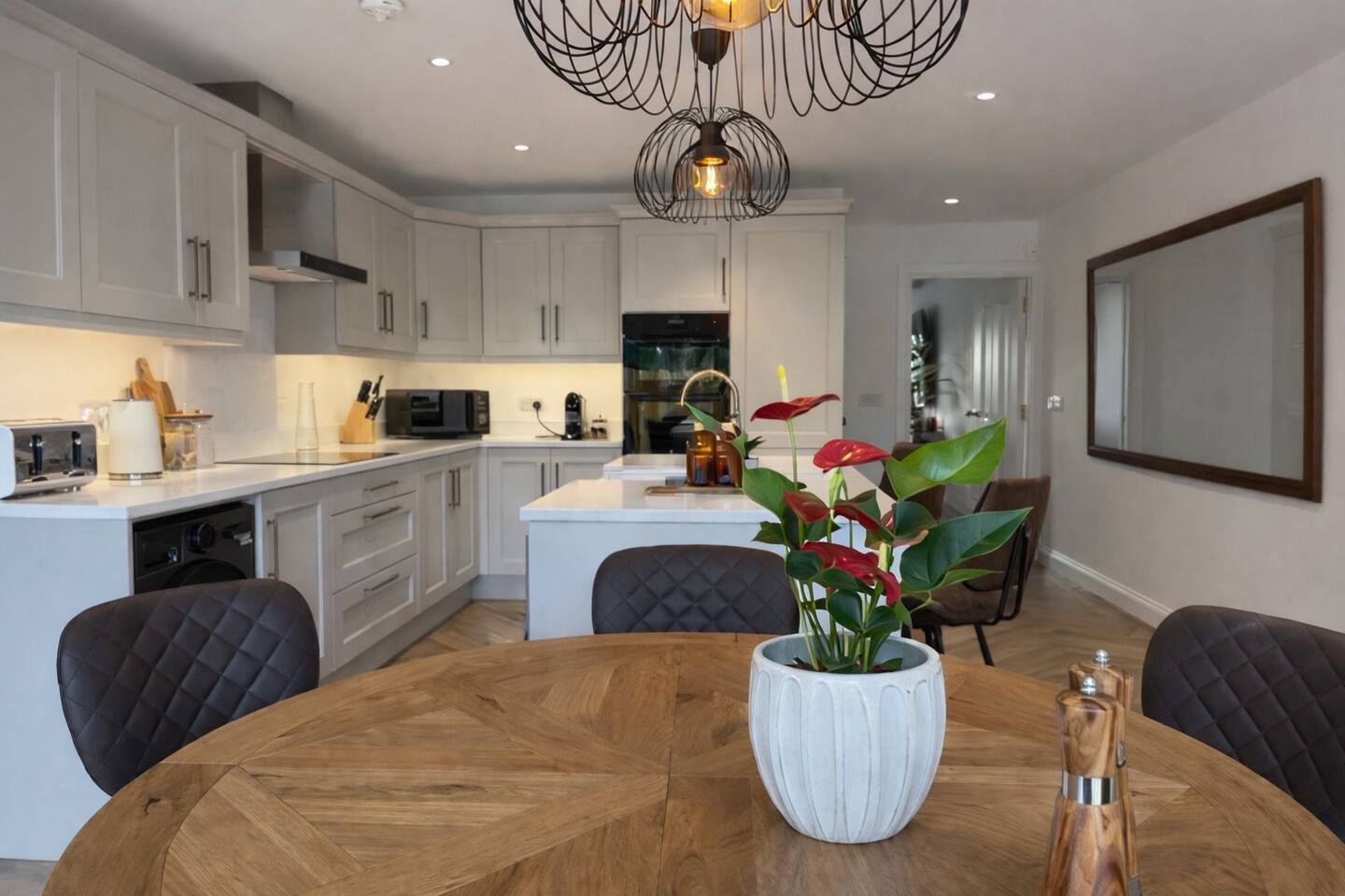 The House — Bushmills The House is a brand-new three-bedroom Lee & Kin stay in historic Bushmills, arranged across two floors and designed as a calm, considered private house for guests who value space, ease and quiet quality. It sleeps six across three bedrooms — two king rooms and one double. The main bedroom includes an ensuite shower, with a family bathroom upstairs and an additional WC on the ground floor. The house offers two distinct places to relax. The main living room is a quiet, settled space to gather or unwind, while a bespoke covered outdoor room extends the living space year-round — a second place to sit, dine, barbecue, or enjoy morning coffee and evening wine. Quietly positioned within a residential setting where countryside meets village life, the house feels private and settled yet remains within easy walking distance of Bushmills’ restaurants, traditional pubs and the Old Bushmills Distillery. A considered private stay — familiar, elevated and uncomplicated — prepared for guests who know how a stay should feel.